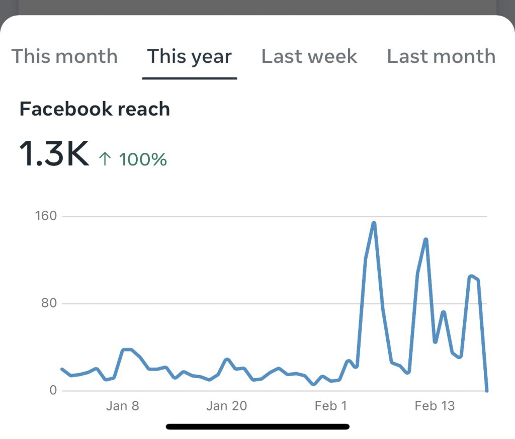 1.3K Facebook Reach (In 1.5 months) – A 100% increase, doubling the number of potential customers seeing their content.